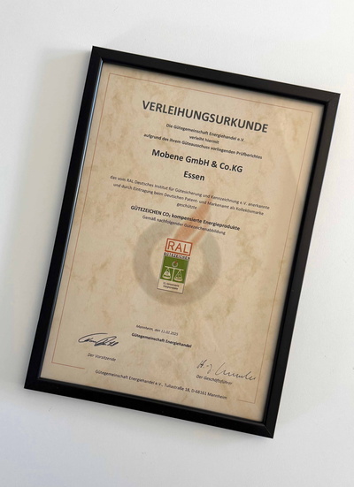 Foto: Verleihungsurkunde der Gütegemeinschaft Energiehandel für die Mobene GmbH & Co. KG